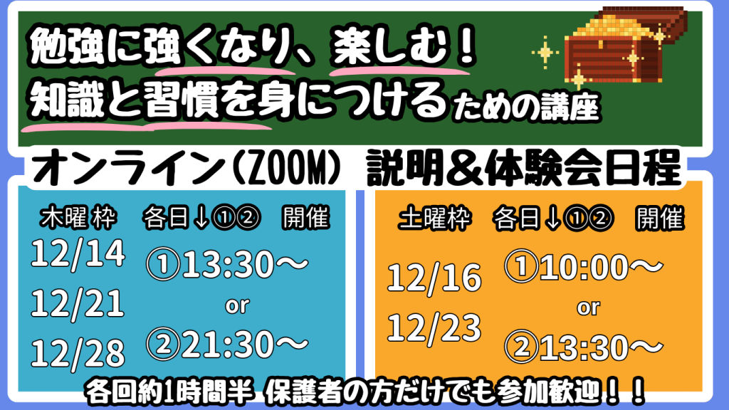 体験会のテーマは、実際に講座でお子さまが学ぶ内容から抜粋しておりますので、どんな内容をどんな雰囲気で学ぶのか?を体験して頂けます。様やお子さまとで、一緒に考えながら体験して頂きます。